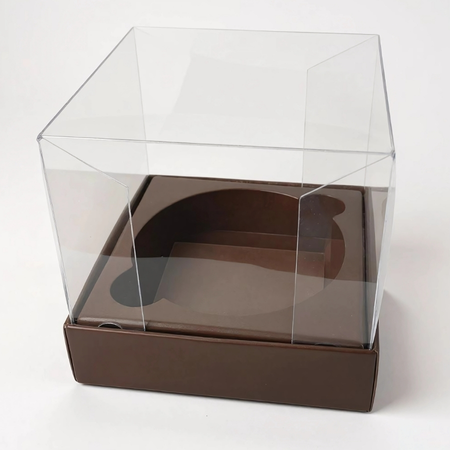 Com dimensões de 7x7x7 cm, a caixa é fabricada em papel cartão marrom de alta gramatura, com tampa de PVC transparente, garantindo resistência e visibilidade ao mesmo tempo. O design permite fácil montagem e empilhamento, tornando-a ideal para transporte e organização. Essa embalagem é perfeita para mini bolos individuais, proporcionando o equilíbrio perfeito entre proteção e apresentação de qualidade.