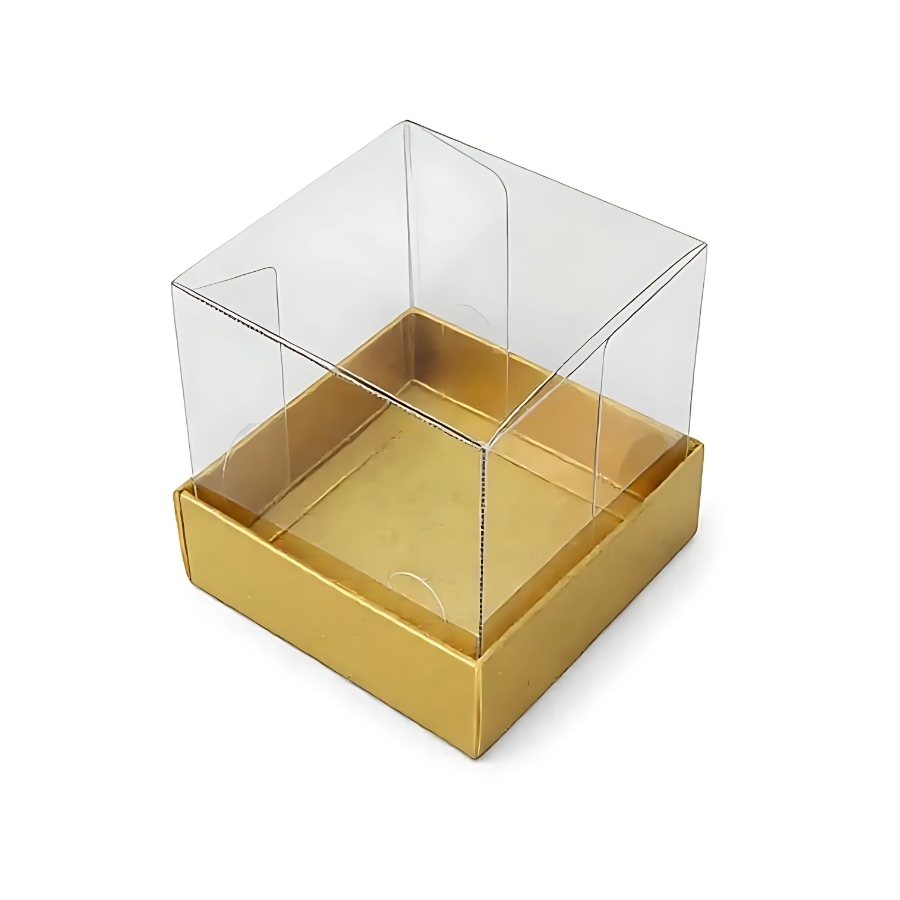 Com dimensões de 4×4×4 cm, essa caixa combina base em papel/acervo PP e tampa em acetato cristal ou plástico, ambos com revestimento dourado. Ideal para acomodar mini bolos, bombons ou forminhas individuais, sua estrutura é resistente, fácil de montar e protege o conteúdo contra sujeira e choques leves. Disponível em kits (geralmente com 10 unidades) nas cores branca, kraft, prata ou dourado.