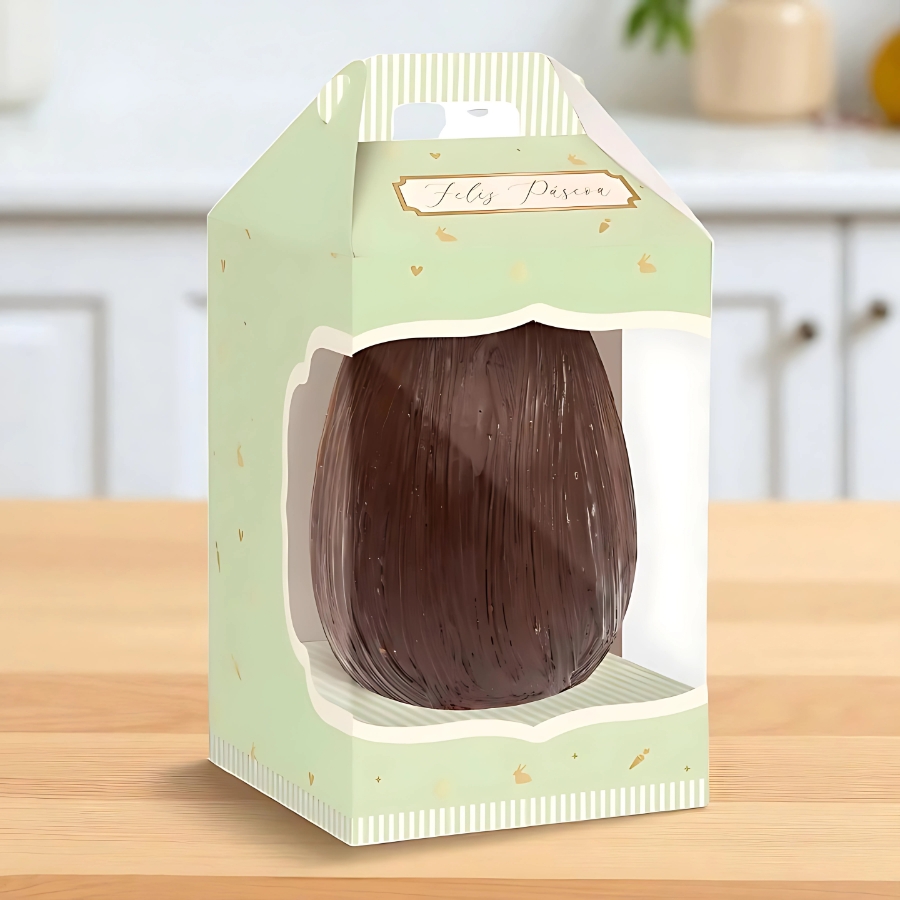 Produzida em papel cartão resistente, a caixa possui formato de maleta com alça prática para transporte e visor transparente que protege e valoriza o ovo de Páscoa. Indicada para ovos artesanais, é uma solução funcional e elegante para confeiteiros, chocolaterias e presentes personalizados.