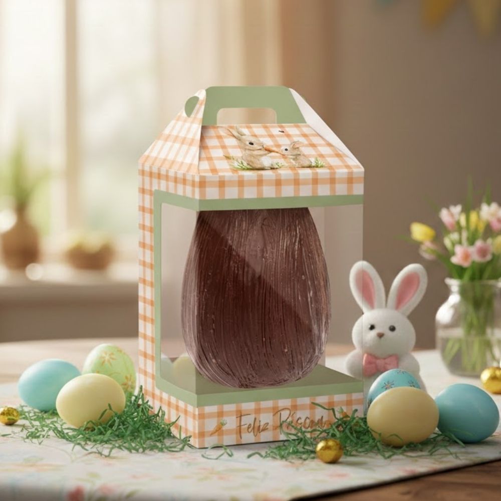 Coloque o ovo de Páscoa de 250g em pé dentro da caixa, ajustando para que fique centralizado e bem visível pelo visor. Indicada para presentes, kits de Páscoa e exposição em vitrines ou pontos de venda.