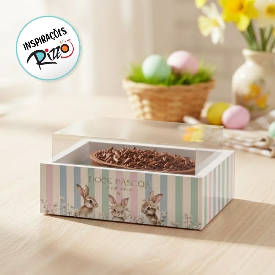 A Caixa New Moldura para Meio Ovo de 350g com Visor – Doce Páscoa é uma embalagem resistente, com moldura estruturada e visor frontal, perfeita para valorizar a apresentação do meio ovo artesanal.