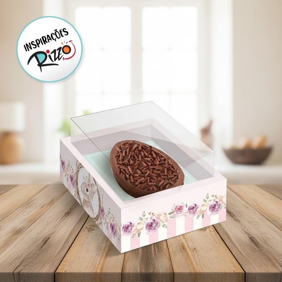 A Caixa New Moldura para Meio Ovo de 350g Coelha Serena é resistente, charmosa e perfeita para apresentações delicadas e temáticas.