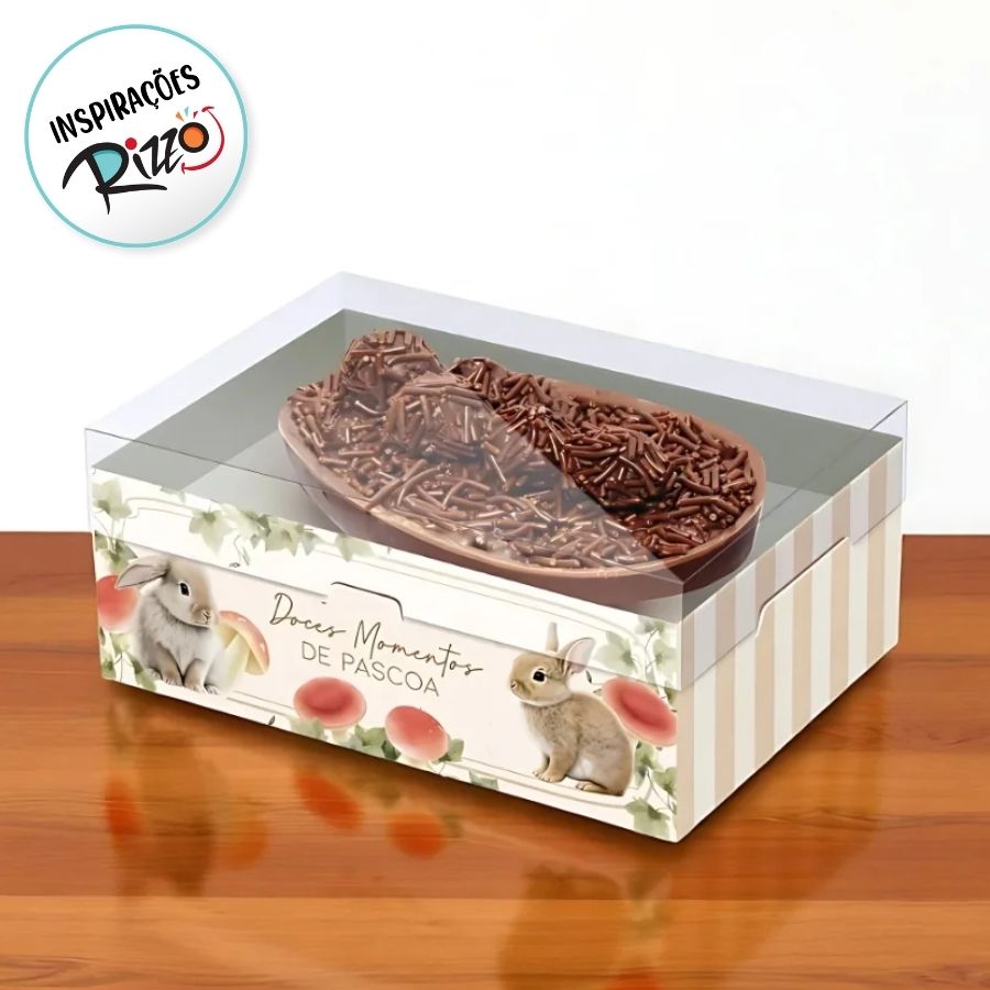 A Caixa New Practice Breeze para meio ovo de 350g é resistente, moderna e perfeita para destacar chocolates artesanais com um visual delicado e elegante.