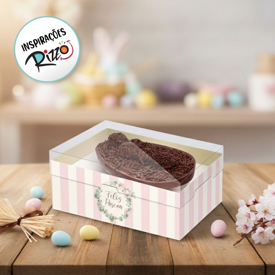 Caixa New Practice para Meio Ovo de 350g com Regulagem de Altura e Colher – Coelha Bella é uma embalagem delicada e encantadora, ideal para valorizar ovos de colher com uma apresentação alegre e temática. A estampa Coelha Bella traz um visual suave e charmoso, perfeito para criar composições especiais e cheias de carinho na Páscoa.