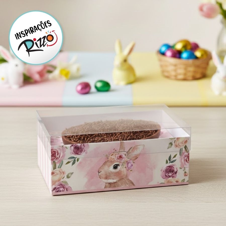 A Caixa New Practice para Meio Ovo de 500g Serena é resistente, delicada e charmosa, ideal para destacar ovos de colher grandes com elegância e um toque especial de Páscoa.