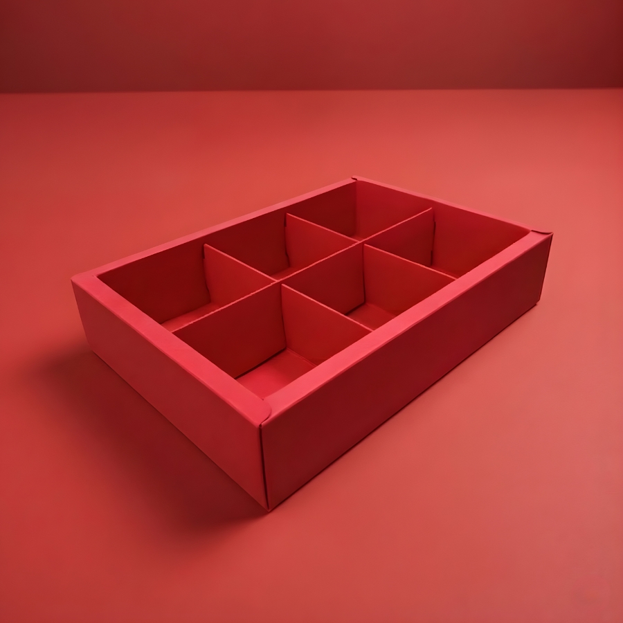 Caixa retangular na cor vermelha, com tampa tipo luva, contendo 6 cavidades internas. Dimensões aproximadas de 24x17x5cm. Indicada para acondicionamento de pão de mel e itens similares. Estrutura leve, recomendada para produtos compatíveis com o tamanho das cavidades. Evitar contato com umidade para preservar a integridade do material.