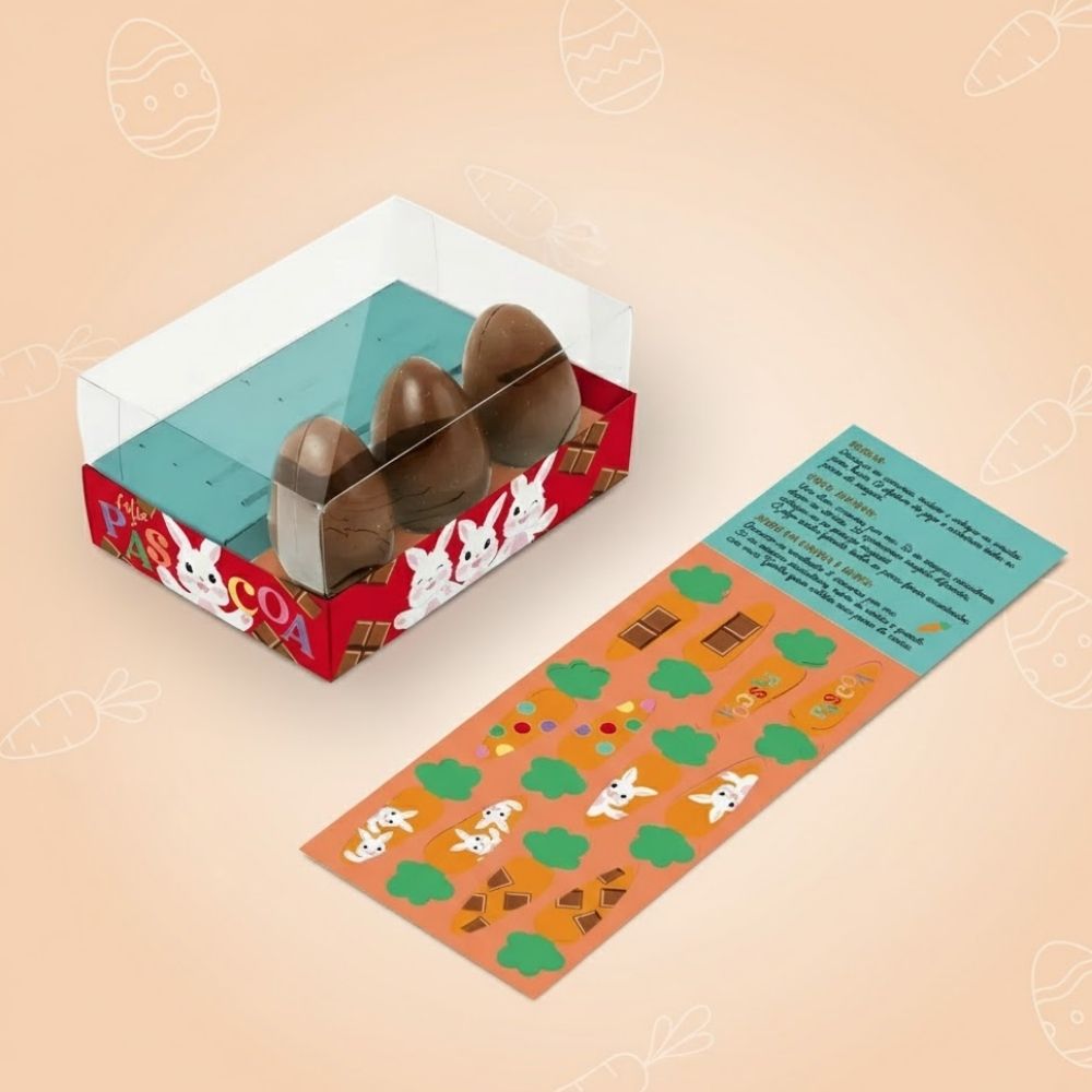 Monte a caixa com 3 ovinhos de 50g e destaque as cartas do jogo da memória para facilitar a brincadeira. Ideal para crianças, escolas, lembranças de Páscoa ou kits temáticos. Combine com outros itens da linha Felicita para uma apresentação ainda mais harmoniosa.