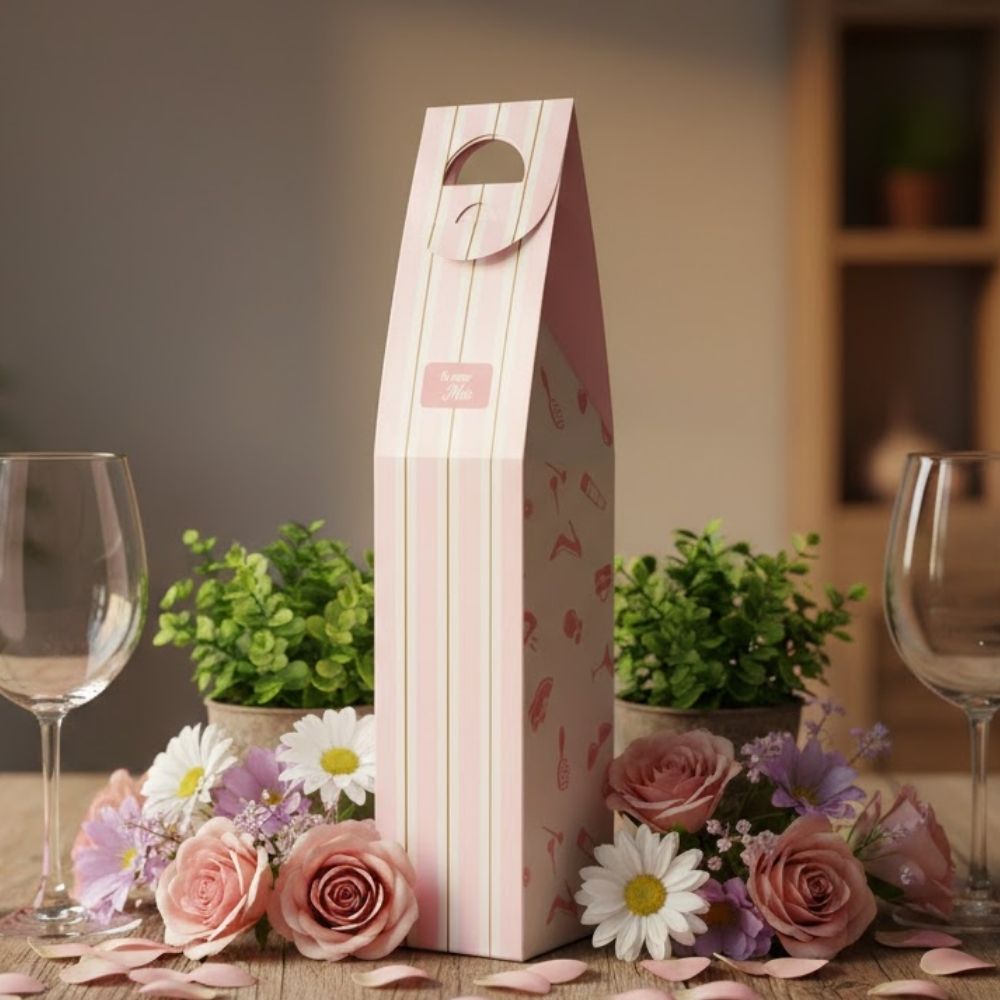 A Caixa Para Garrafa Mãe Essência é perfeita para presentear com elegância e delicadeza. A linha Mãe Essência combina listras em branco e rosa com estampa temática de lazer e bem-estar, trazendo elementos femininos que remetem a momentos especiais e autocuidado, criando uma apresentação charmosa e atual.