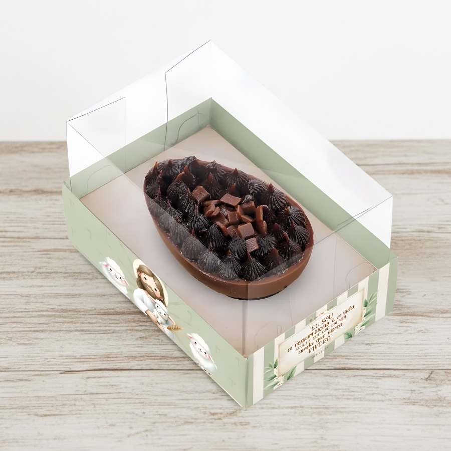 Indicada para confeiteiros, chocolaterias, lojistas e consumidores finais, esta caixa resolve a dificuldade de acomodar meio ovo de 50g com segurança e boa apresentação. O tamanho compacto aliado ao tema Ressurreição facilita a criação de lembranças de Páscoa simbólicas e bem-acabadas, ideais para vendas, presentes e ações comemorativas.