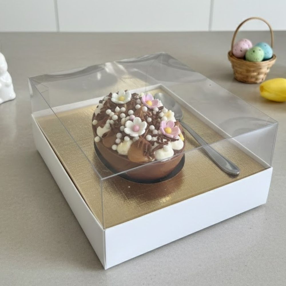 Com tamanho aproximado de 15x13x6,5cm, acomoda meio ovo de colher de até 150g com segurança e organização. Possui espaço lateral para encaixe de colherzinha, garantindo praticidade e um acabamento mais completo, ideal para entregar o produto pronto para consumo e com uma apresentação profissional.