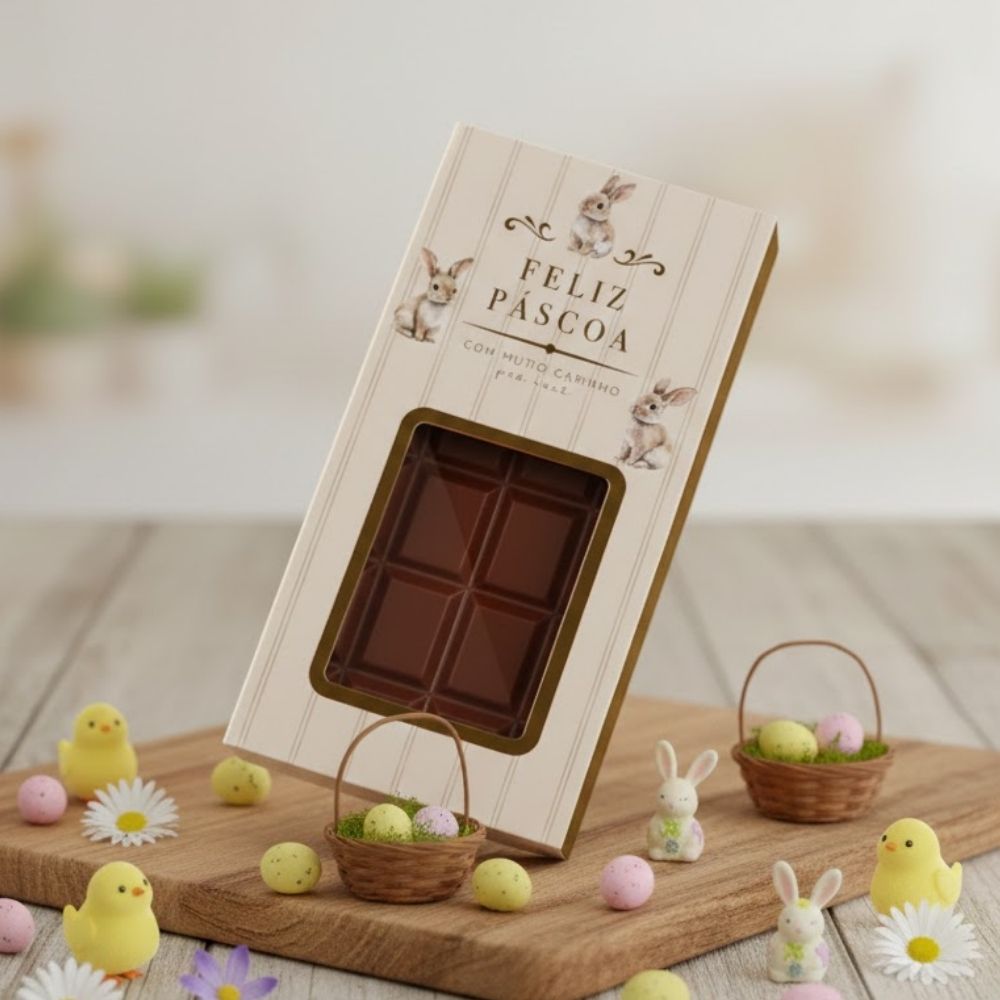 Montar a caixa conforme as dobras indicadas, inserir o tablete de chocolate de até 200g e fechar corretamente. Ideal para chocolates artesanais, presentes de Páscoa e venda de barras decoradas. Armazenar em local seco e protegido da umidade.