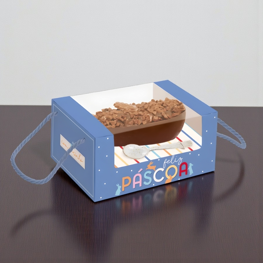 Com alça integrada e colher inclusa, oferece facilidade no transporte e conveniência para o consumidor, sendo ideal para presentes, lembranças e vendas personalizadas de Páscoa.