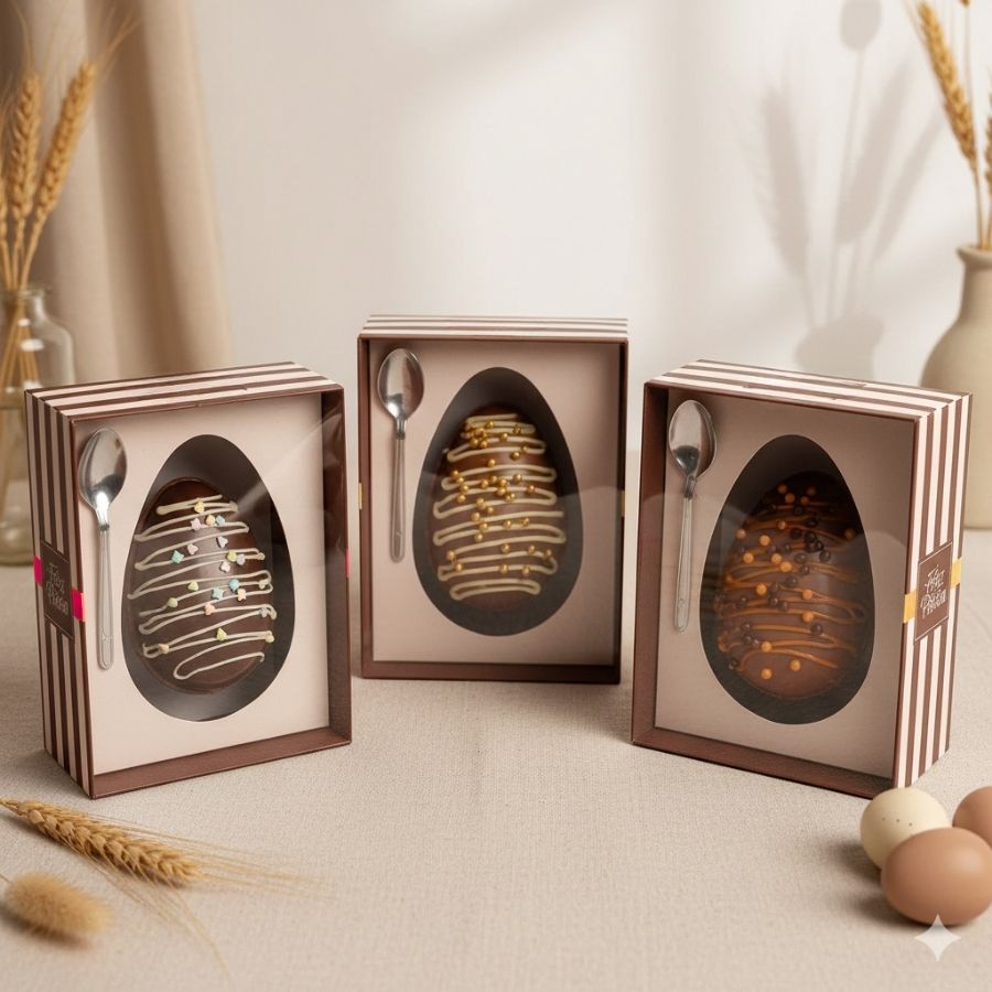 A embalagem acompanha colheres plásticas prateadas, agregando praticidade ao consumo e elevando a experiência do presente. É uma excelente escolha para chocolatiers, confeiteiros, lojas e produção de kits presenteáveis, unindo funcionalidade, estética e excelente custo-benefício para a temporada de Páscoa.