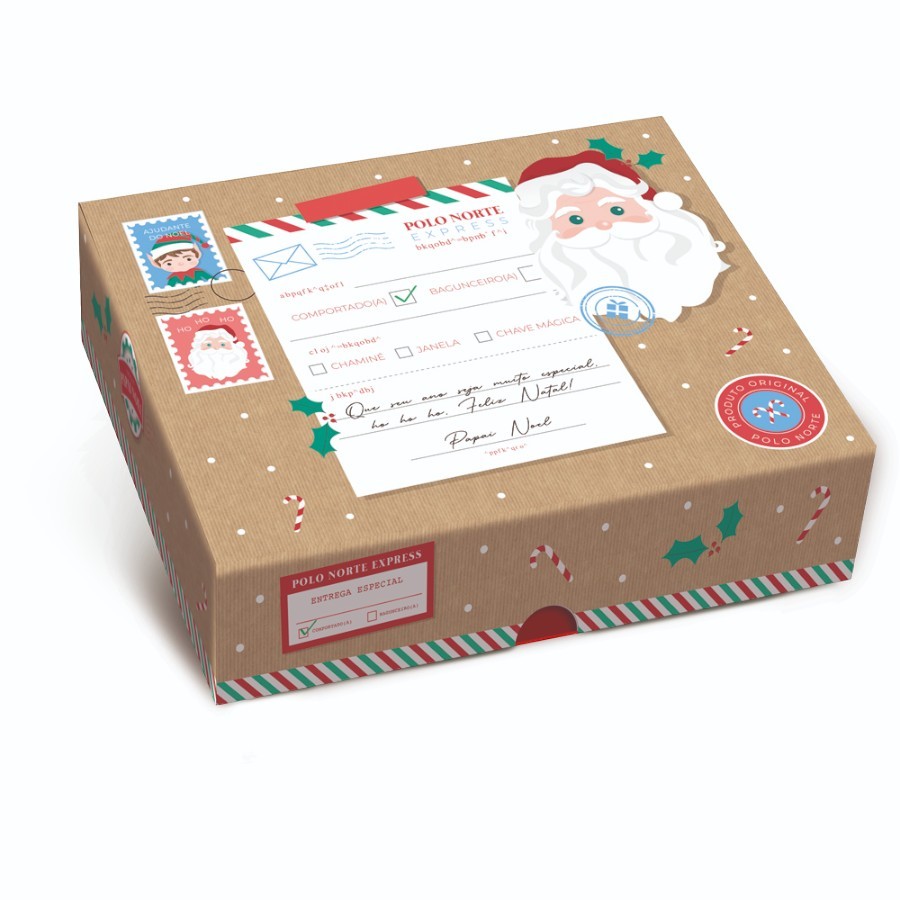 Caixa em papel cartão, com estampa temática de natal, com design de entrega do polo norte, com o fundo kraft, destacando o papai noel e "Ho Ho Ho" acima, e alguns selos de entrega