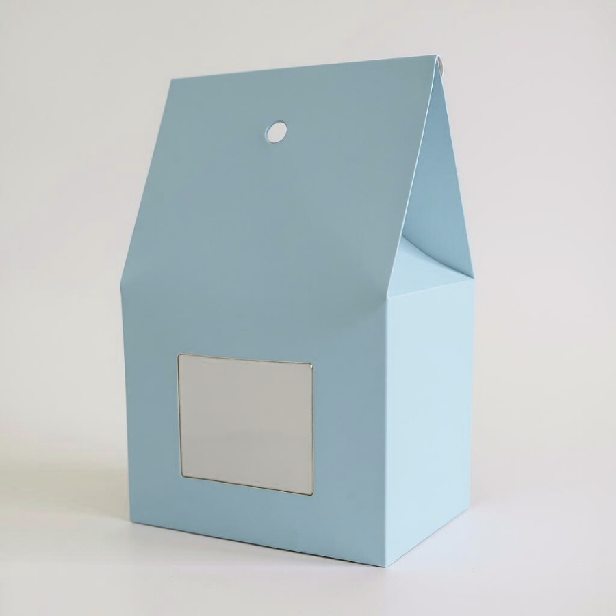 Caixa modelo sacolinha com visor transparente frontal, fabricada em papel resistente na cor azul claro. Medidas aproximadas: 7,5cm x 12cm x 5,5cm. Ideal para doces finos, bombons, trufas, mini lembranças e brindes personalizados. Estrutura fácil de montar, com alça para transporte e excelente apresentação visual. Indicado para festas, eventos corporativos, datas comemorativas e uso profissional.
