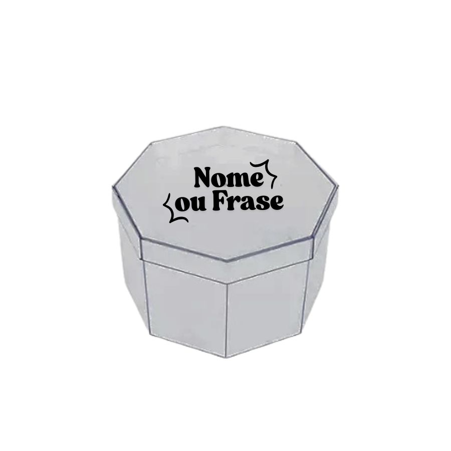 A Caixinha Acrílica Octogonal é perfeita para quem busca uma apresentação original e elegante. Com formato octogonal e medidas de 11x7cm, ela se destaca pela personalização com nome ou frase em preto, tornando-se um item único para brindes e lembranças.