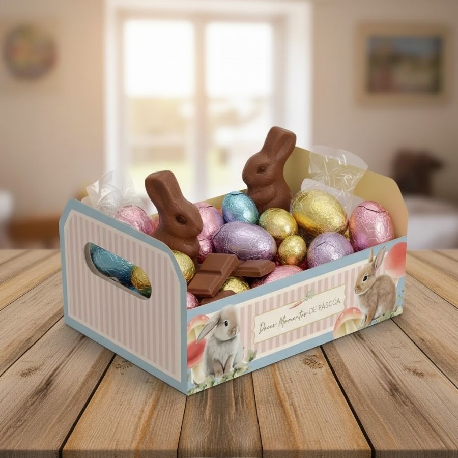 Produzido em papel cartão resistente, o caixote garante firmeza, leveza e um acabamento temático suave, perfeito para Páscoa, lembrancinhas, confeitarias e presentes personalizados. O visual Coelho Breeze transmite um estilo delicado e alegre, valorizando ainda mais o conteúdo do presente.