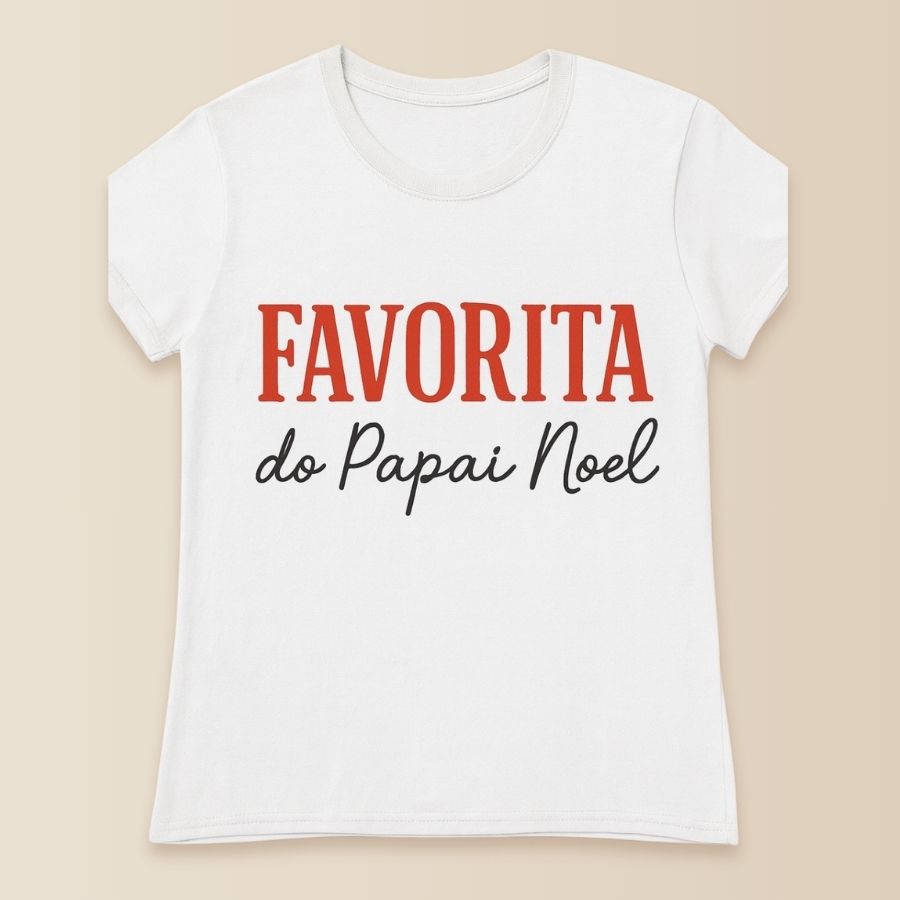 Camiseta branca estampada adulta da linha exclusiva Favorita Do Papai Noel da Rizzo, disponível nos tamanhos P, M, G e GG. Confortável, prática e perfeita para celebrar o Natal com a família.