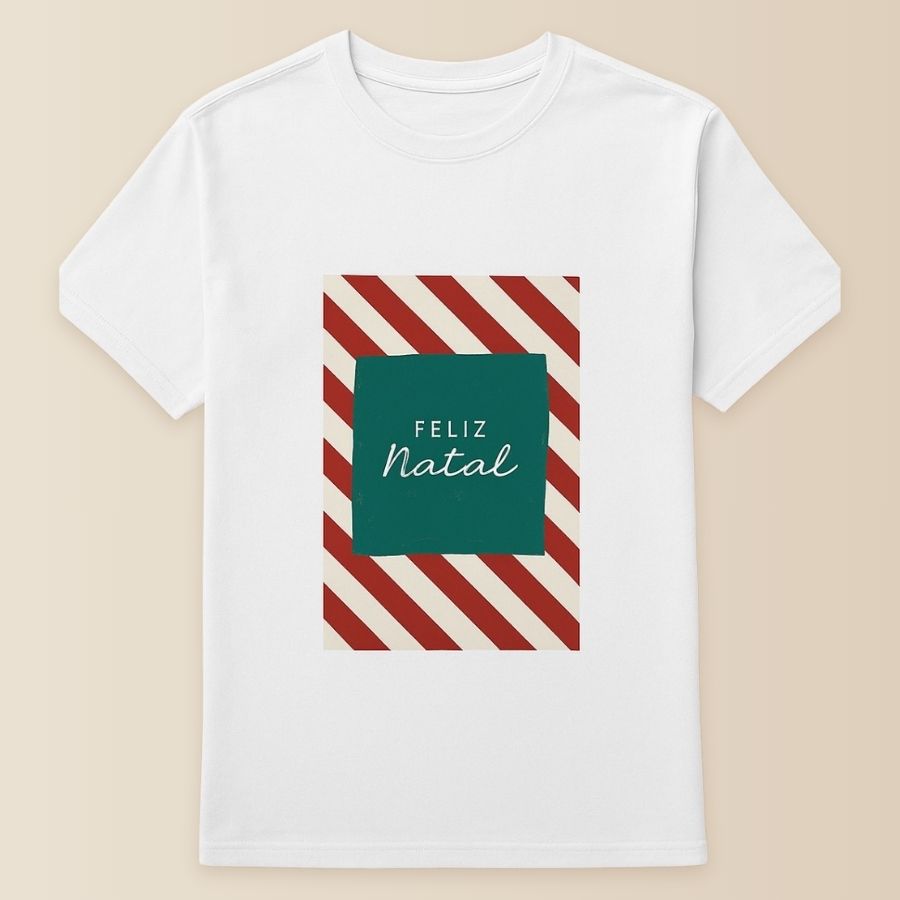 Camiseta branca estampada Natal Listras da linha exclusiva da Rizzo, disponível nos tamanhos P, M, G e GG, ideal para vestir, presentear e celebrar em família no Natal.