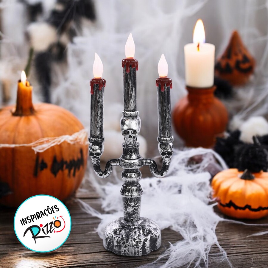 Este candelabro com caveiras é perfeito para decorar mesas ou qualquer ambiente, trazendo um toque autêntico e aterrorizante ao Halloween.