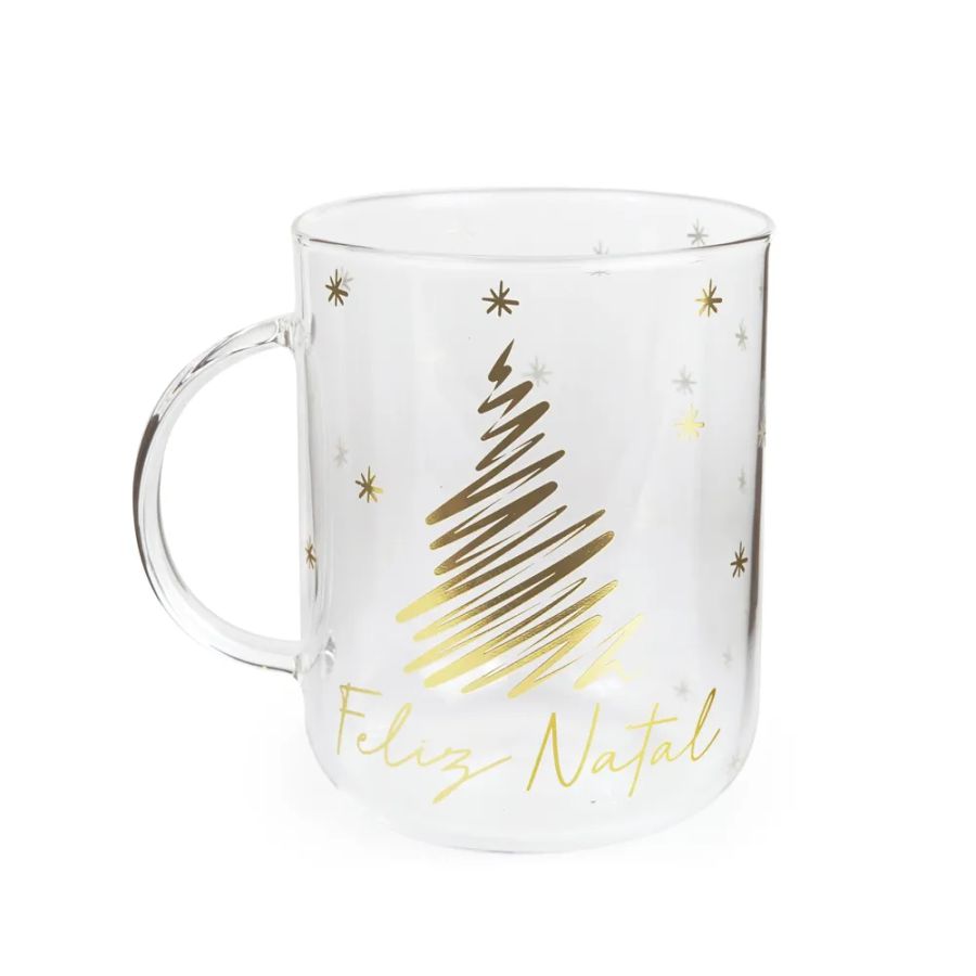 Caneca de vidro com capacidade de 470ml, estampada com uma árvore de Natal e a mensagem "Feliz Natal", perfeita para as festividades.