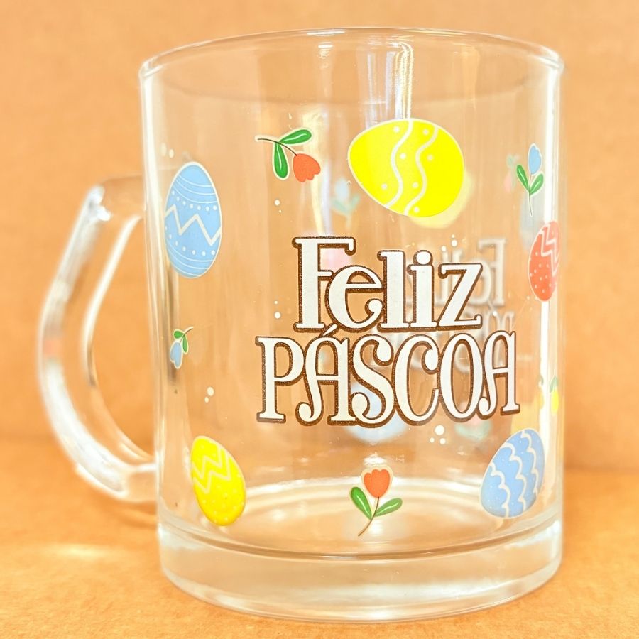 caneca de vidro; Feliz Páscoa; decoração de Páscoa; presente de Páscoa; estampa temática; caneca decorada; acessório de Páscoa; caneca personalizada; item decorativo; lembrancinha de Páscoa; utensílio de cozinha; caneca transparente; copo de vidro; caneca comemorativa; detalhe especial; design sofisticado; bebida quente; bebida fria.