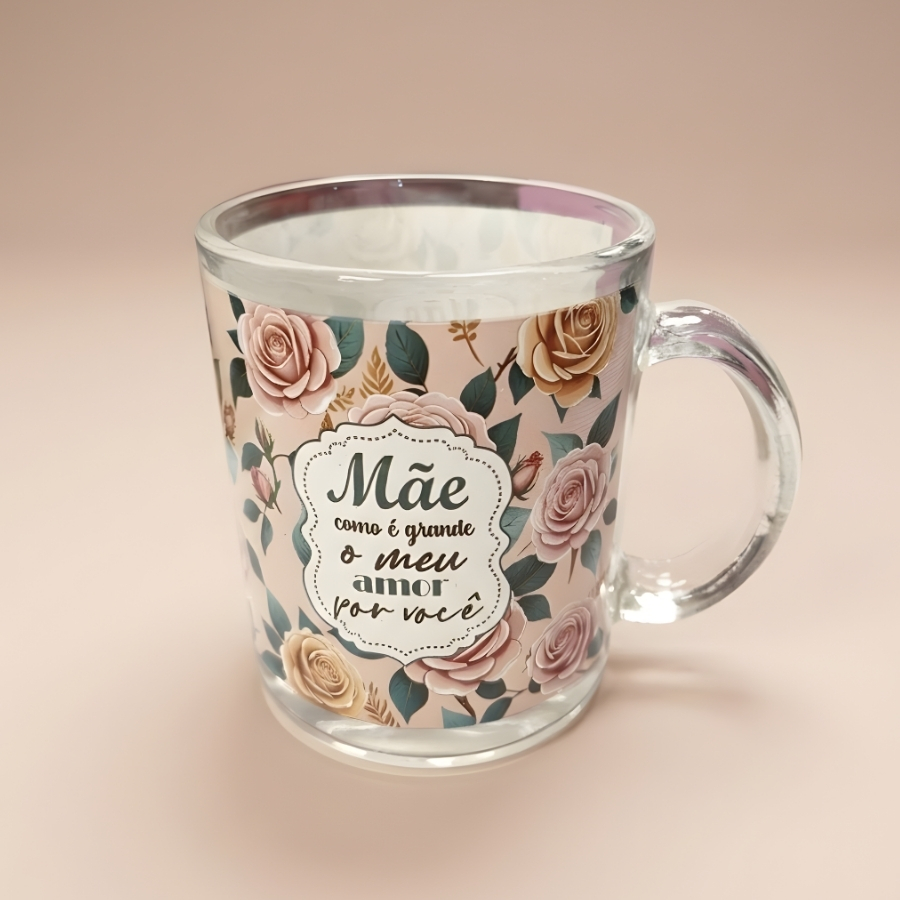 Caneca de vidro transparente na cor bege com flores, com estampa da frase “Mãe Como é Grande o Meu Amor Por Você”. Capacidade de 320ml. Indicada para uso com bebidas. Produto fabricado em vidro. Recomenda-se manuseio cuidadoso para evitar quedas ou impactos que possam causar danos. A capacidade informada corresponde ao volume máximo aproximado que a caneca comporta.