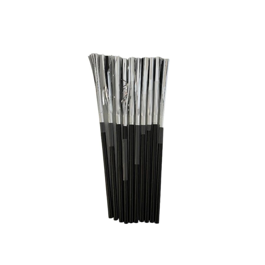 Canudo de papel preto com franja prata de 20cm, ideal para festas e eventos, trazendo estilo, brilho e sustentabilidade às bebidas e decorações.