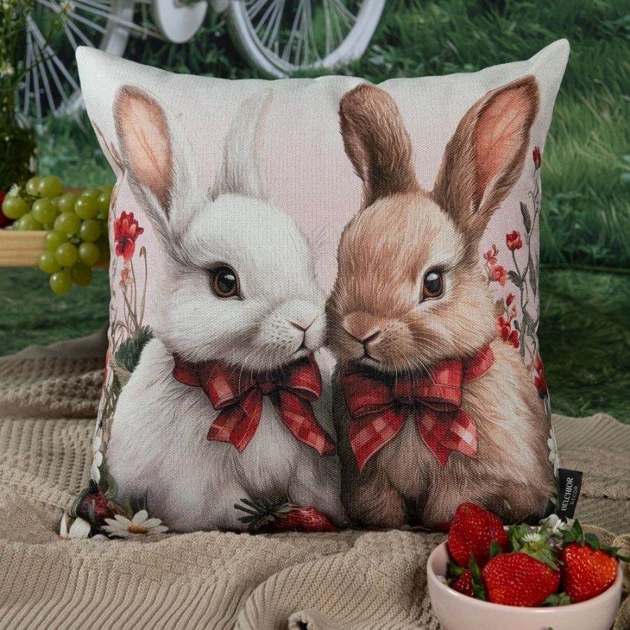 Capa para almofada de Páscoa premium em poliéster, com estampa de coelhos no campo de morangos, na cor vermelha. Encanto açucarado e sofisticação para a decoração pascal.