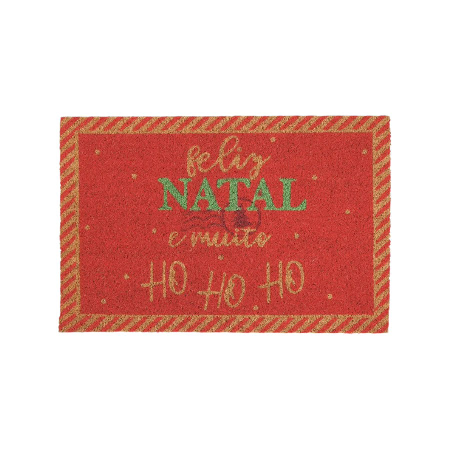 Capacho de fibra com temática natalina, apresentando um fundo vermelho vibrante. No centro, destaca-se a mensagem festiva "Feliz Natal e Muito HO HO HO", adicionando um toque alegre à entrada de qualquer casa.