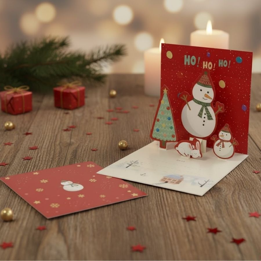 Cartões 3D de Natal com temas variados, como Papai Noel, Rena, Boneco de Neve, Urso Polar, Árvore e Cabana de Natal, medindo 11x11cm. Ideais para presentear, decorar e expressar afeto com charme e originalidade.
