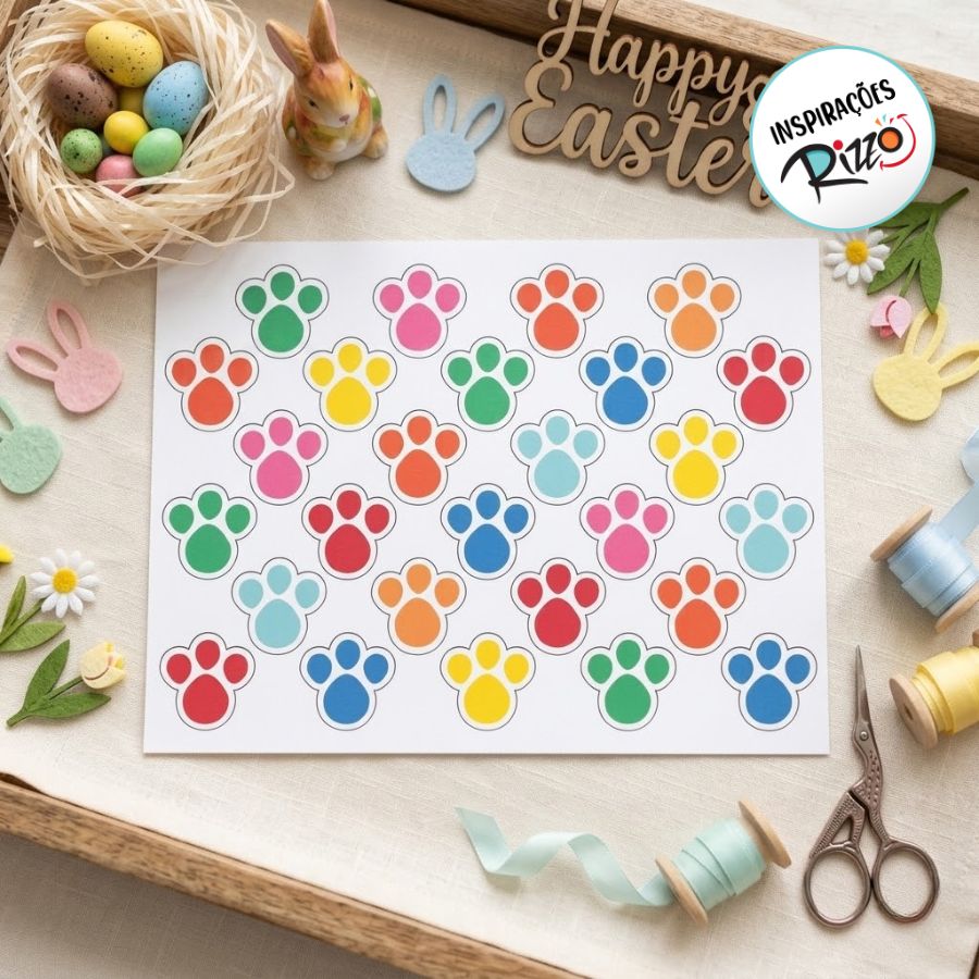 Cartela adesiva para páscoa de patinhas de coelho coloridas.