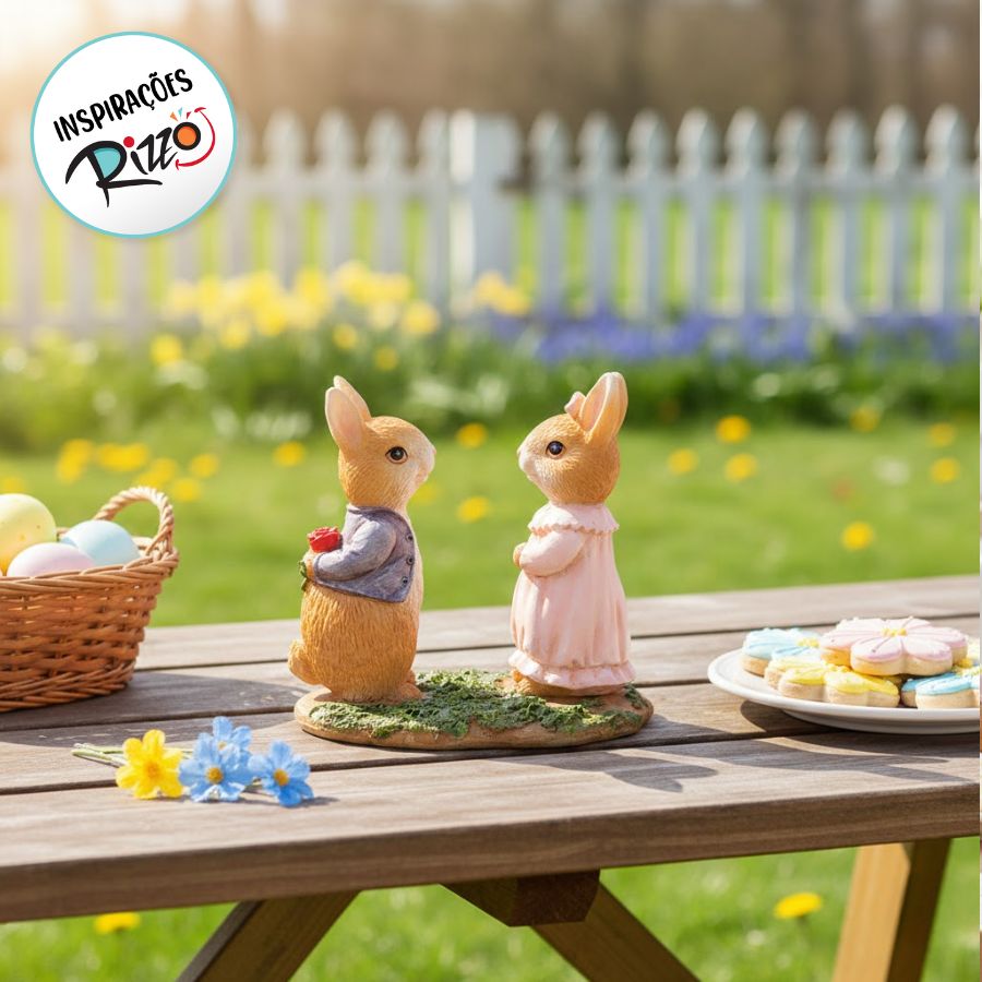 A Decoração de Cerâmica do Casal Coelho se Declarando é uma peça encantadora que captura o romantismo e a doçura de um momento especial. Um coelho, elegantemente esculpido em cerâmica, está representado se declarando para sua coelha, criando uma cena cheia de ternura e emoção. A atenção aos detalhes, desde as expressões faciais até os gestos delicados, transmite a delicadeza desse momento romântico.