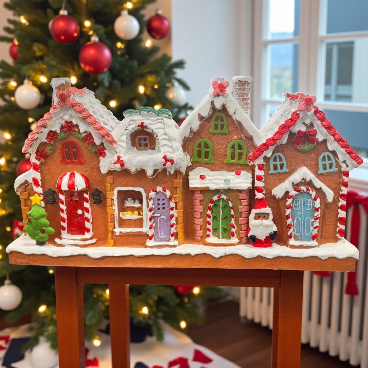 O Cenário de Natal com Som e Movimento – Vila Natalina de Gengibre é uma peça encantadora criada para transformar qualquer ambiente em um cantinho mágico e acolhedor. Composto por quatro casinhas fofas alinhadas lado a lado, todas com luzinhas internas que brilham suavemente, este cenário remete ao charme das tradicionais vilas feitas de biscoito de gengibre. O efeito iluminado junto ao design detalhado deixa o visual ainda mais especial, perfeito para trazer o espírito natalino para salas, mesas decoradas, aparadores e vitrines.