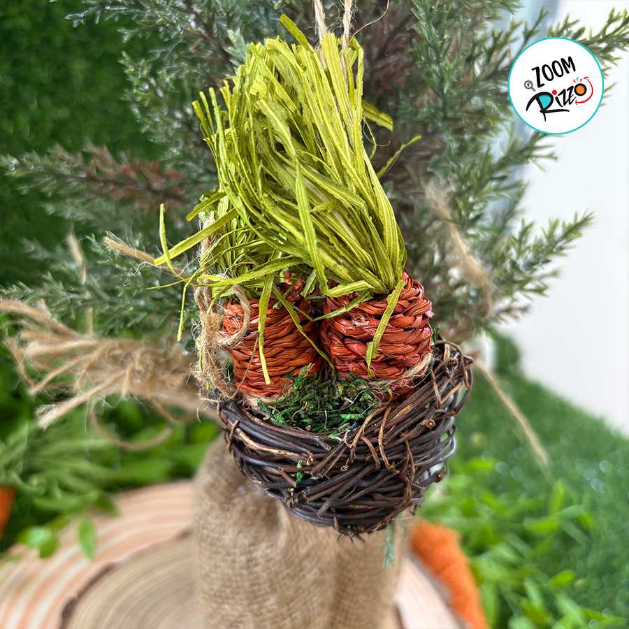 Belo enfeite de páscoa trabalhado em palha mostrando cenouras numa cesta. Serve tanto em ambientes mais modernos como em ambientes mais rústicos. Trazendo um equilíbrio ideal e contraste entre clássico e natural.