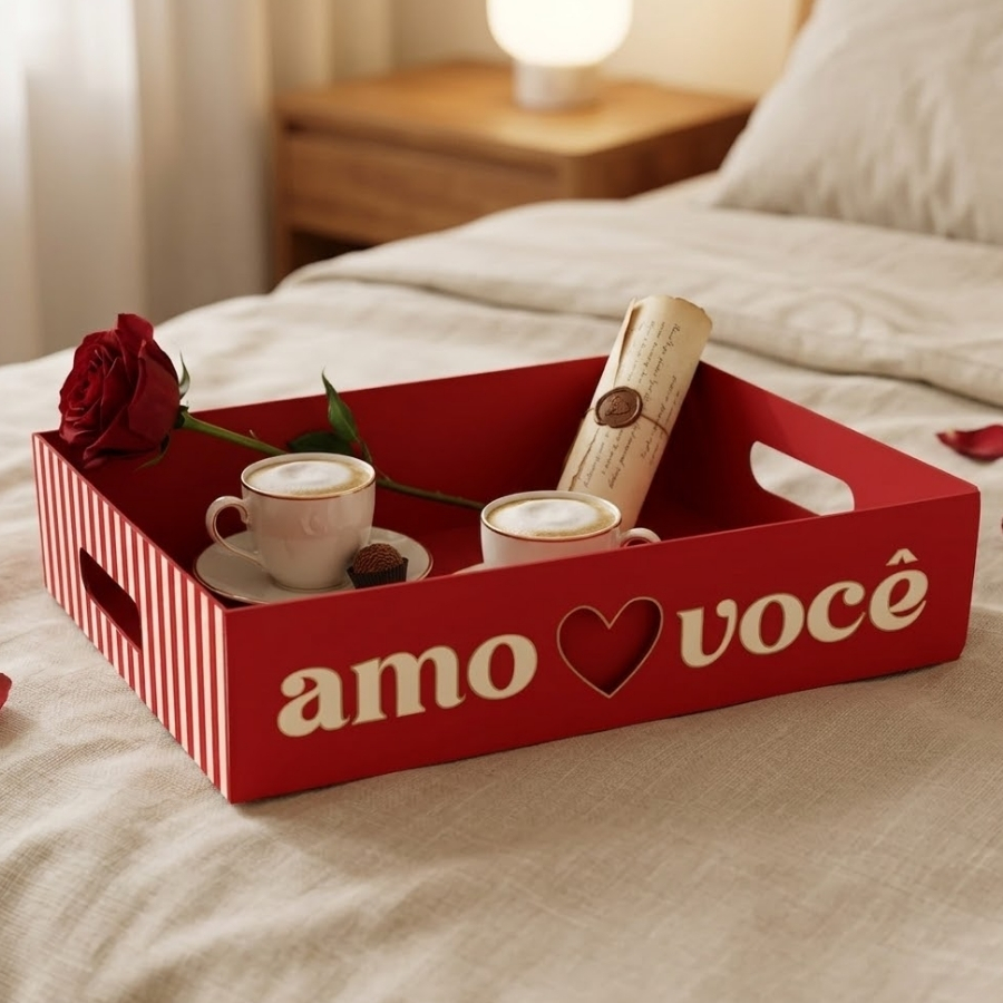 Cesta bandeja modelo História de Amor, tamanho M. Possui dimensões aproximadas de 26,5cm de comprimento, 19,5cm de largura e 6cm de altura. Indicada para organização, montagem de kits e uso decorativo. Recomenda-se evitar contato com umidade ou excesso de peso para preservar a integridade do produto.