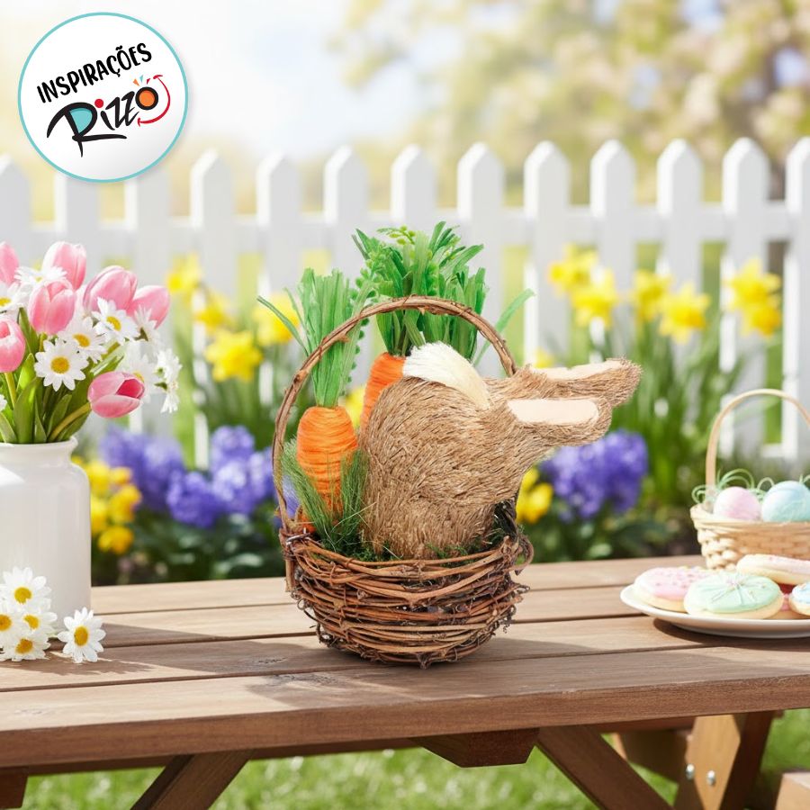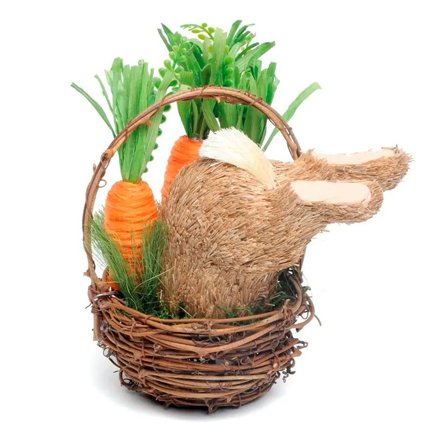 Cesta decorativa com cenouras e um coelho feito de palha invadindo a Cesta