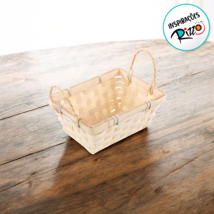 Esta cesta decorativa de bambu apresenta um design retangular e elegante, com alças que facilitam o manuseio. Medindo 18cm, ela é ideal para organizar itens pequenos ou como peça decorativa em mesas e prateleiras. O bambu, material naturalmente resistente e com aparência rústica, confere um charme especial, enquanto a alça prática permite que a cesta seja facilmente transportada ou pendurada. Sua estrutura natural e leve torna-a perfeita para compor arranjos de Páscoa, seja com ovos de chocolate ou flores, oferecendo um toque orgânico e acolhedor à decoração.