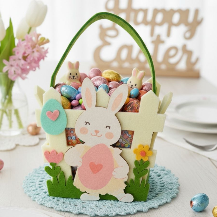 Confeccionada em feltro, essa cesta é ideal para acomodar chocolates, mini ovos de Páscoa, bombons, doces e pequenas lembrancinhas. Suas medidas aproximadas de 12x10,5cm a tornam perfeita para kits presenteáveis, lembranças infantis, mesas de Páscoa, decoração temática e vitrines. Leve e prática, pode ser reutilizada como item decorativo após a data comemorativa.