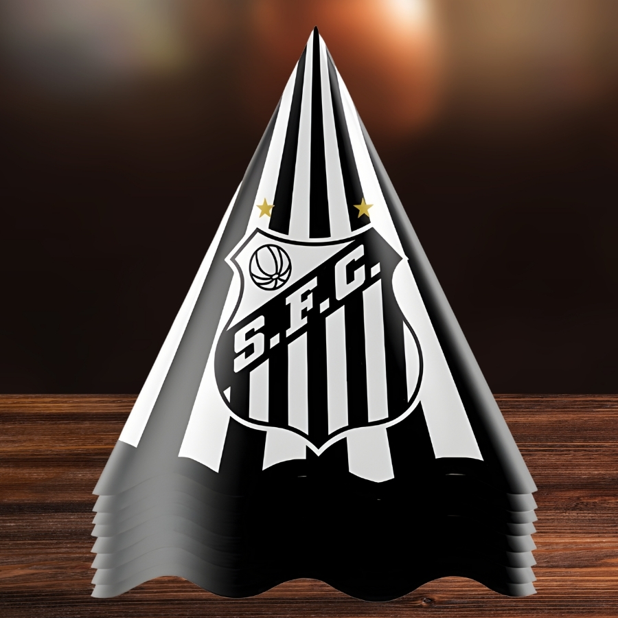 Chapéu decorativo de aniversário no tamanho 16x13cm, com tema Santos. Leve, prático e ideal para festas temáticas e celebrações de torcedores.