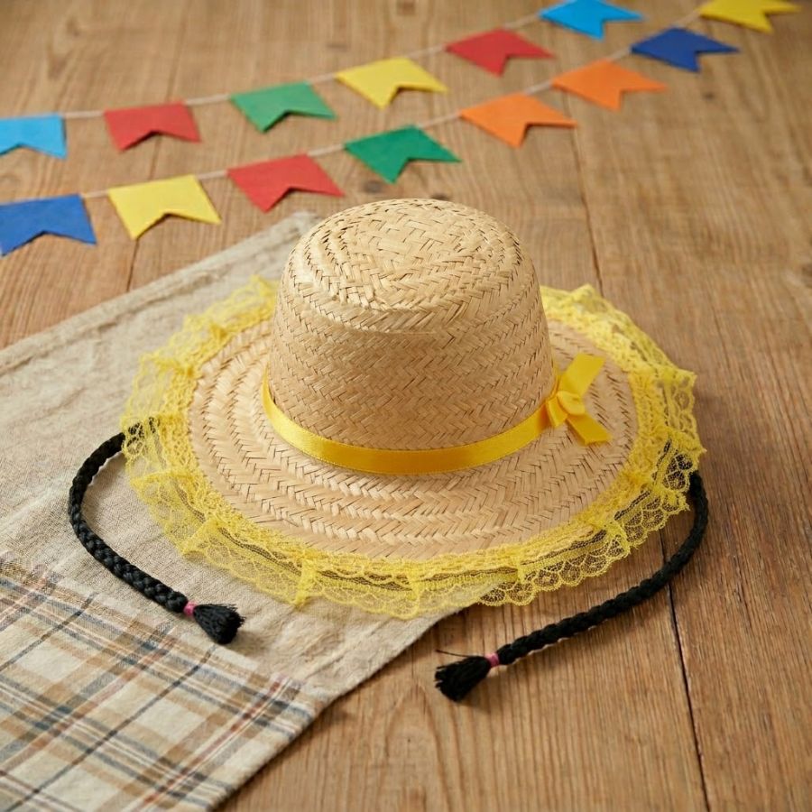 O Chapéu de Palha de Renda com Trança - Amarelo - 19x30cm é um acessório decorativo feito em palha, com detalhes em renda e trança, na cor amarela. Ideal para festas juninas, fantasias e decoração temática, é leve, versátil e fácil de personalizar.