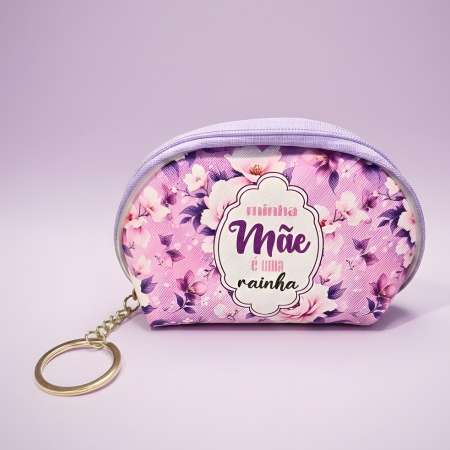 Chaveiro bolsinha porta moedas fabricado em material resistente na cor roxa, com dimensões aproximadas de 11cm x 7cm x 3cm. Possui estampa com a frase “Minha Mãe é Uma Rainha”. Indicado para armazenamento de moedas, pequenas notas e objetos de pequeno porte. Não é resistente à imersão em água. Para limpeza, utilizar pano macio levemente umedecido e evitar produtos abrasivos para preservar a estampa e o material.
