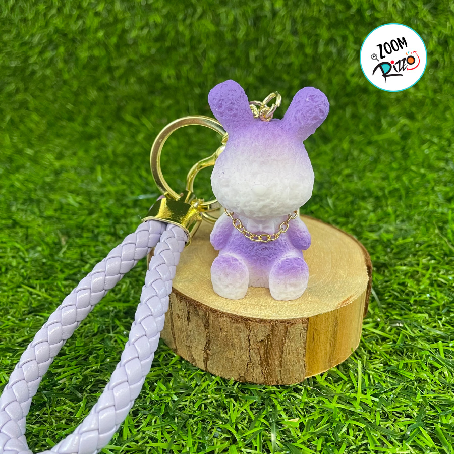 Chaveiro de Coelho na cor Roxo com degradê Lilás, colar de corrente dourada, mini laço e tira em Lilás com sino.