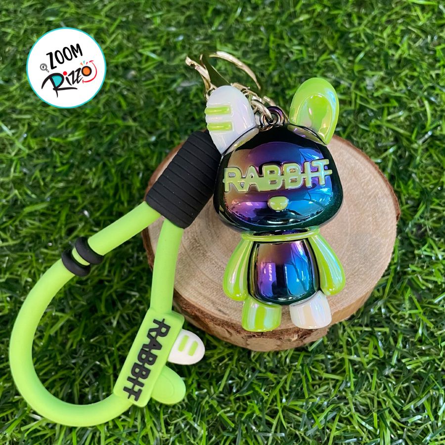 Chaveiro de Coelho Metalizado, com corpo na cor furtacor escuro em roxo e azul, orelhas e pernas em verde água e branco e escrito ''Rabbit' no rosto, também em verde. Tira emborrachada na cor verde e preto, com orelhinhas e escrito ''Rabbit''
