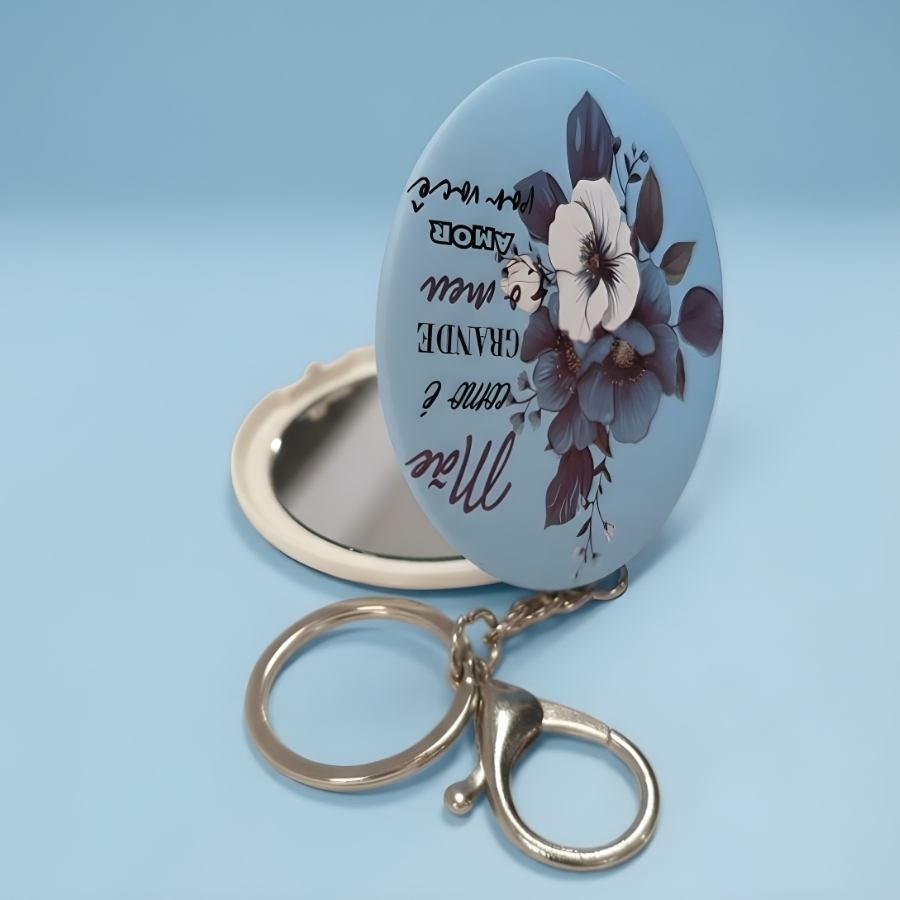 Na cor azul, traz um toque moderno e elegante, combinando facilmente com bolsas, mochilas e chaves. Compacto e funcional, oferece a praticidade de ter um espelho sempre à mão, tornando-se um mimo útil e especial para presentear em datas comemorativas ou surpreender no dia a dia.
