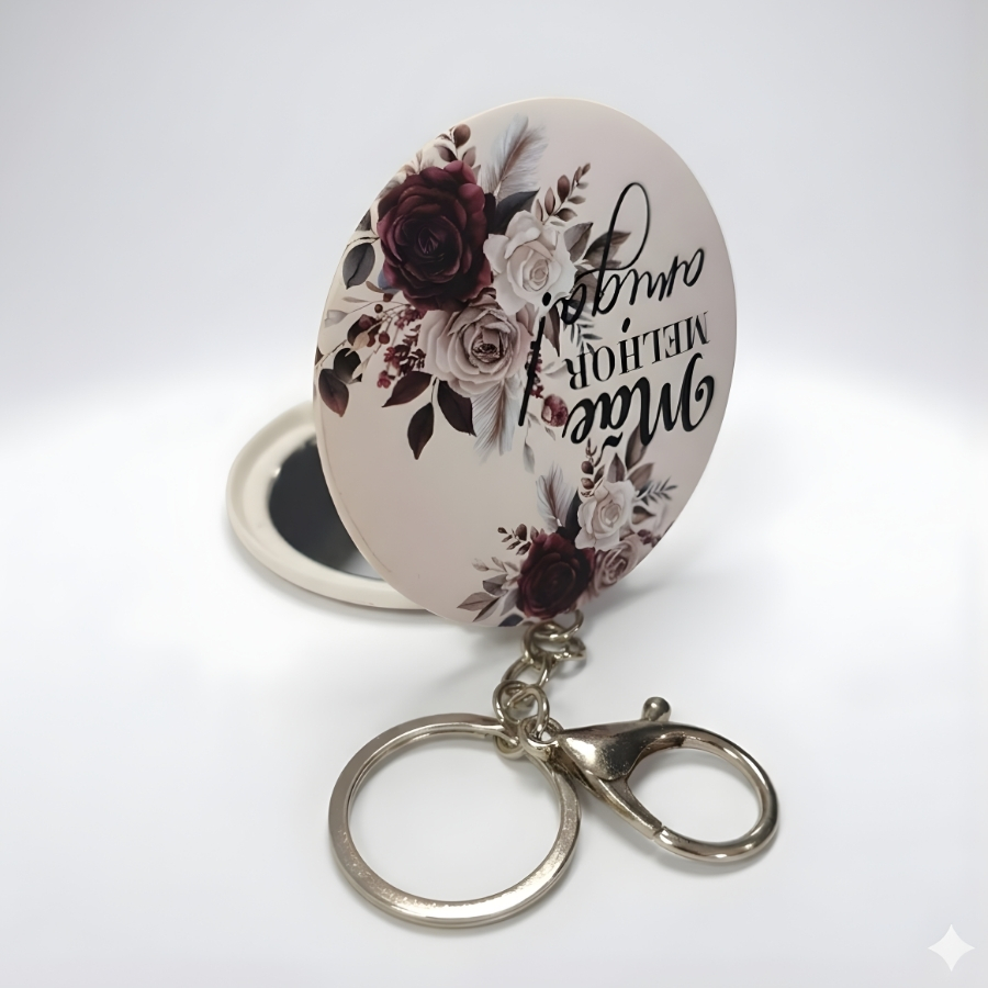 Na cor bege, transmite elegância e suavidade, combinando facilmente com bolsas, mochilas e chaves. Compacto e funcional, garante praticidade com um espelho sempre à mão quando necessário. Um mimo útil e simbólico para presentear em datas especiais ou surpreender com um gesto cheio de significado.