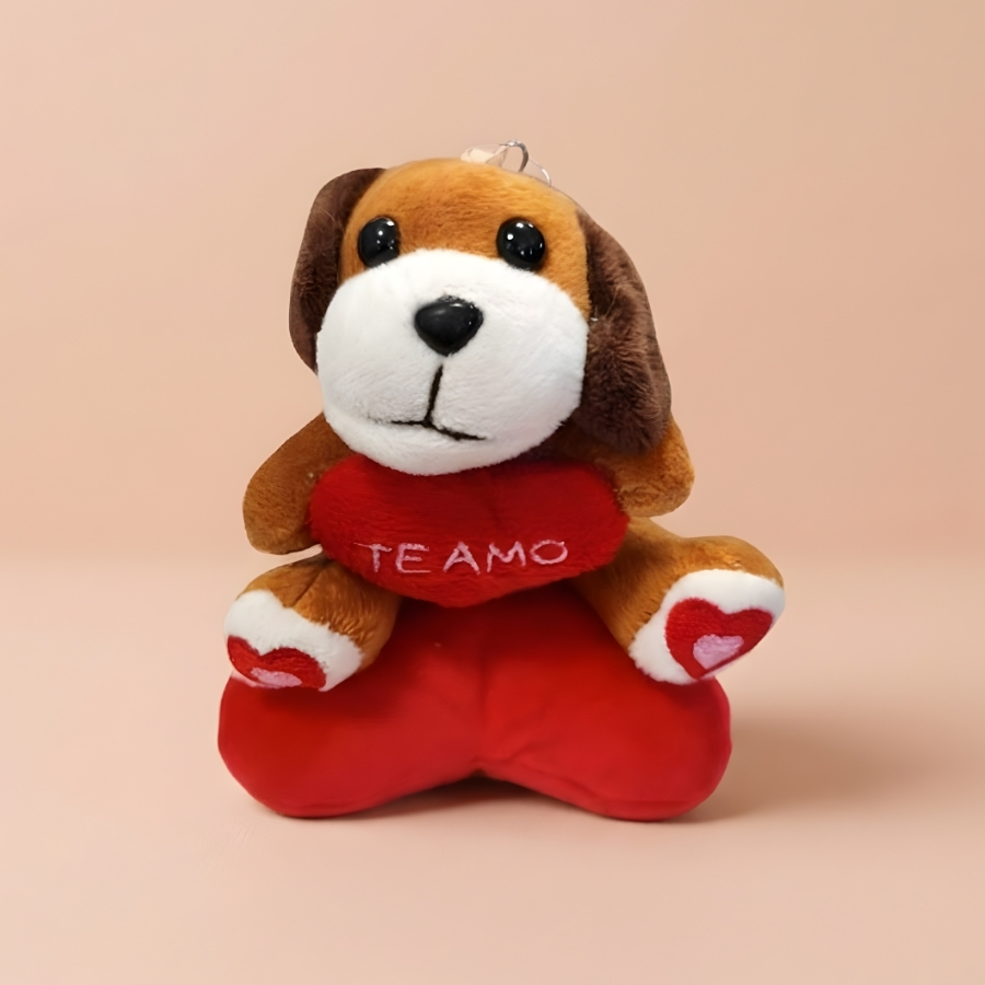 Chaveiro de pelúcia com temática “Te Amo”, no formato de cachorro com coração. Dimensões aproximadas de 10x12x6cm. Indicado para uso como acessório em chaves, bolsas e similares. Recomenda-se evitar contato com umidade excessiva e realizar limpeza adequada para produtos em pelúcia. As medidas informadas correspondem ao tamanho aproximado do produto.