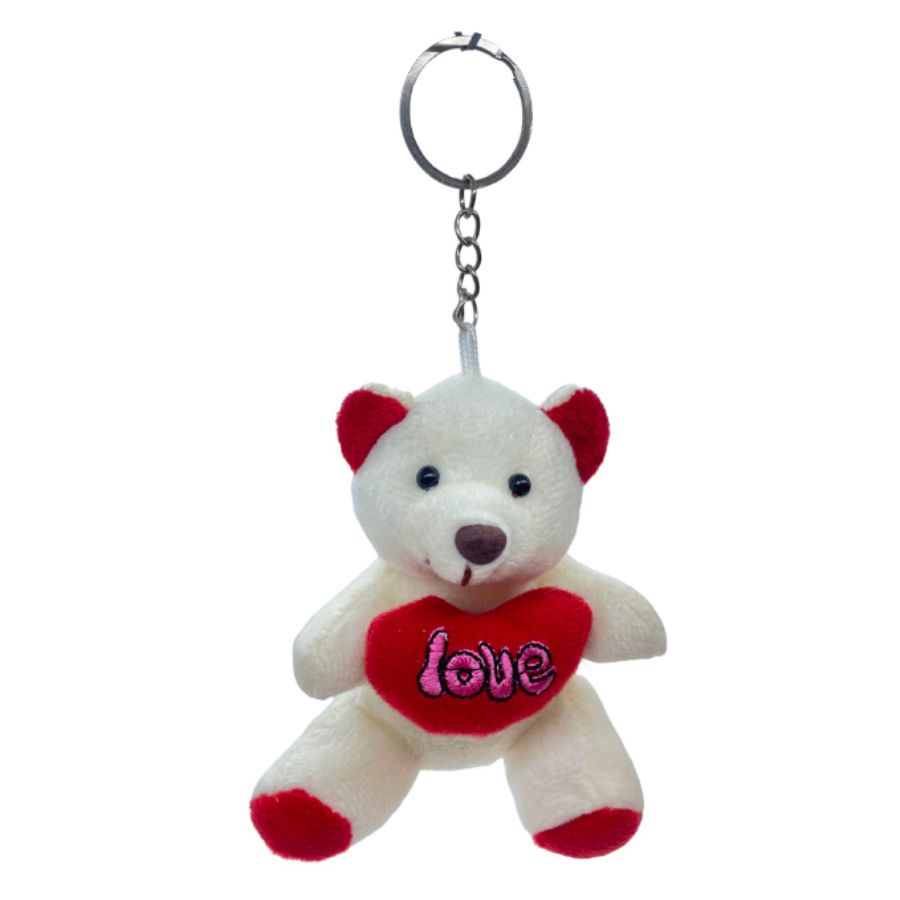 Chaveiro de Urso Branco de Pelúcia, com detalhes em vermelho, segurando coração vermelho com escrito Love