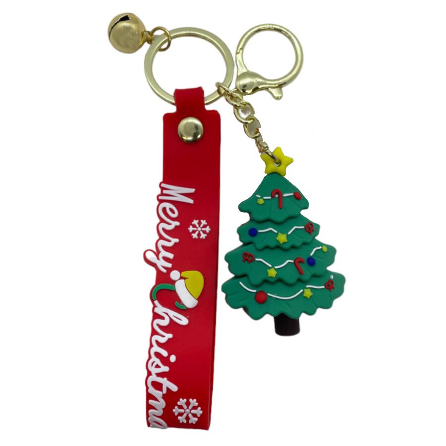Chaveiro de Natal com árvore de natal cheia de detalhes, com estrela na ponta e tira de silicone vermelho com escrito ''Merry Christmas'' com desenhos brancos e sino