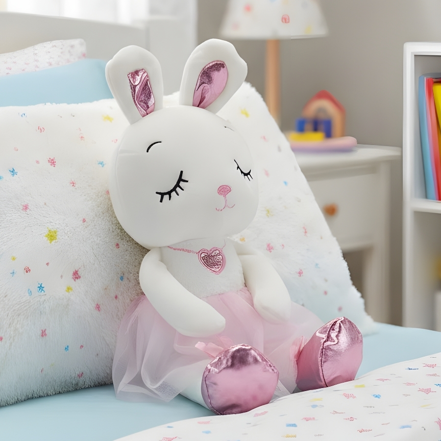 Indicada para composições decorativas e ambientações temáticas, essa coelha de pelúcia pode complementar diferentes espaços, agregando um toque decorativo. A saia rosa valoriza a proposta estética do produto.